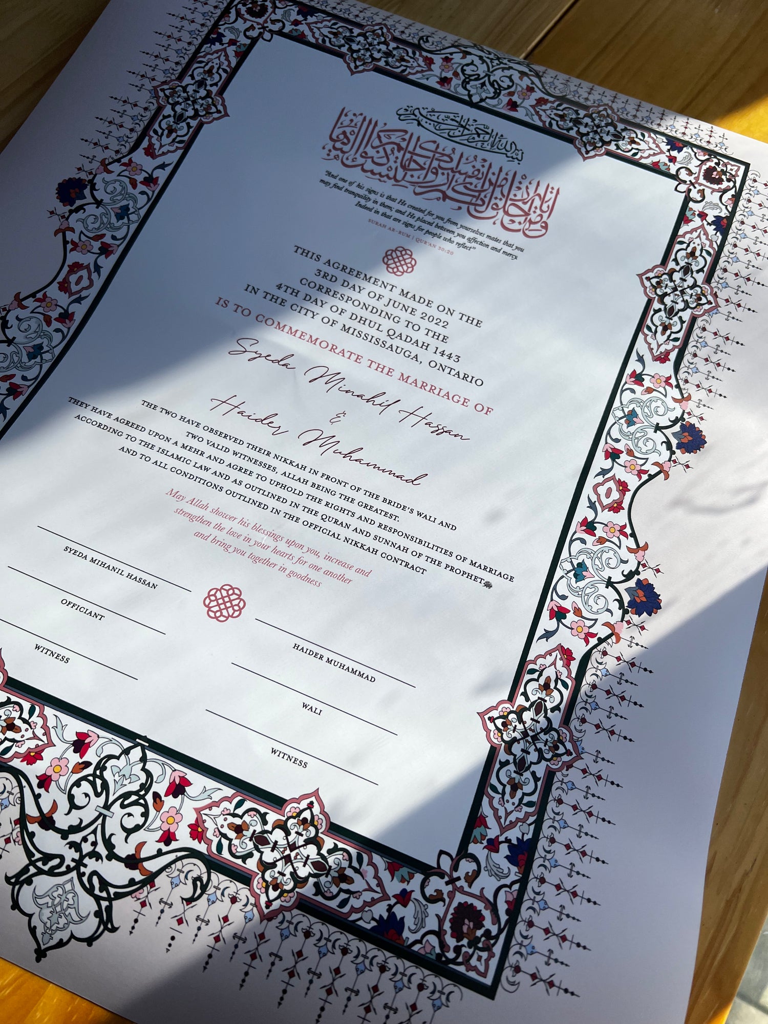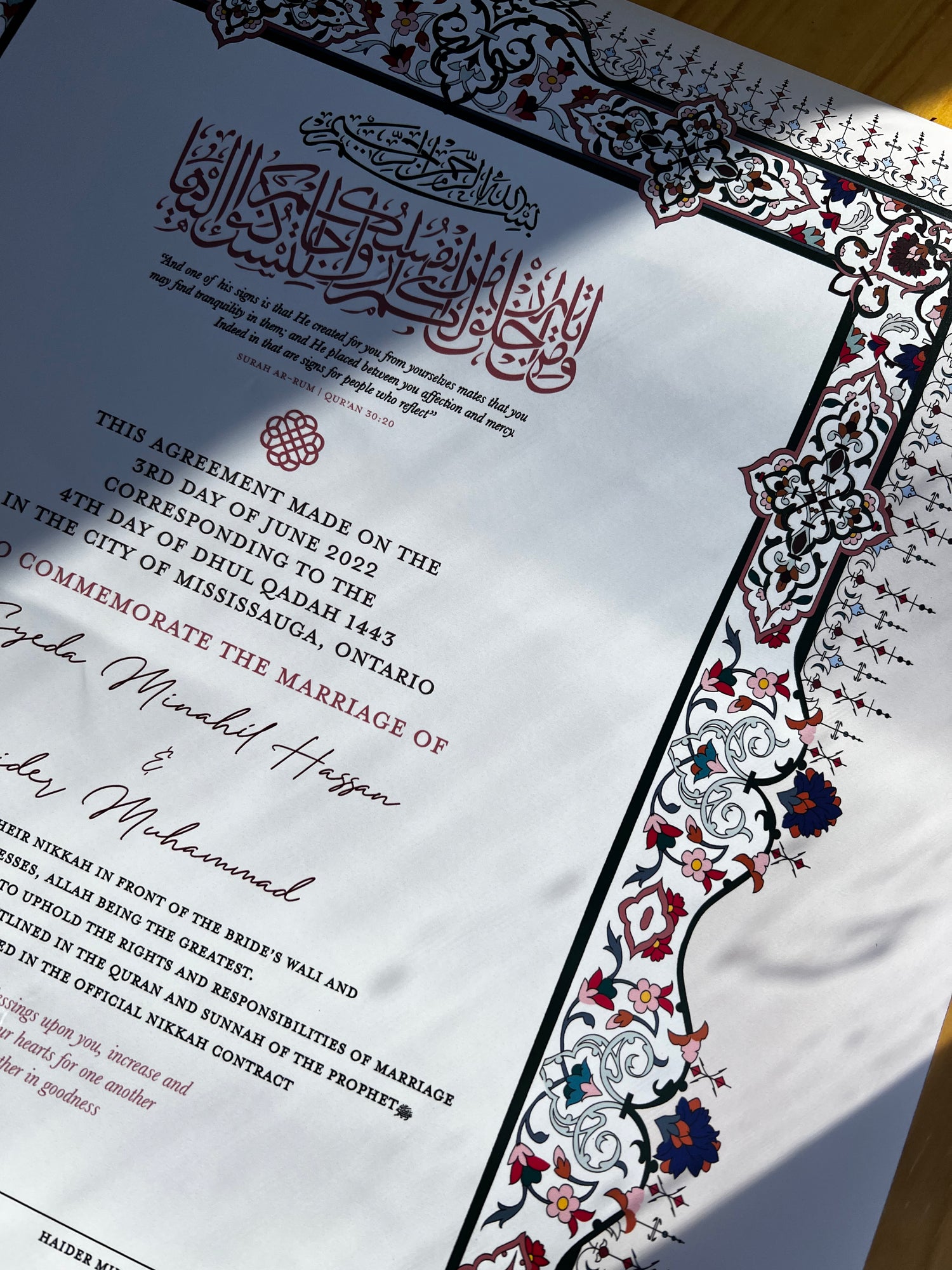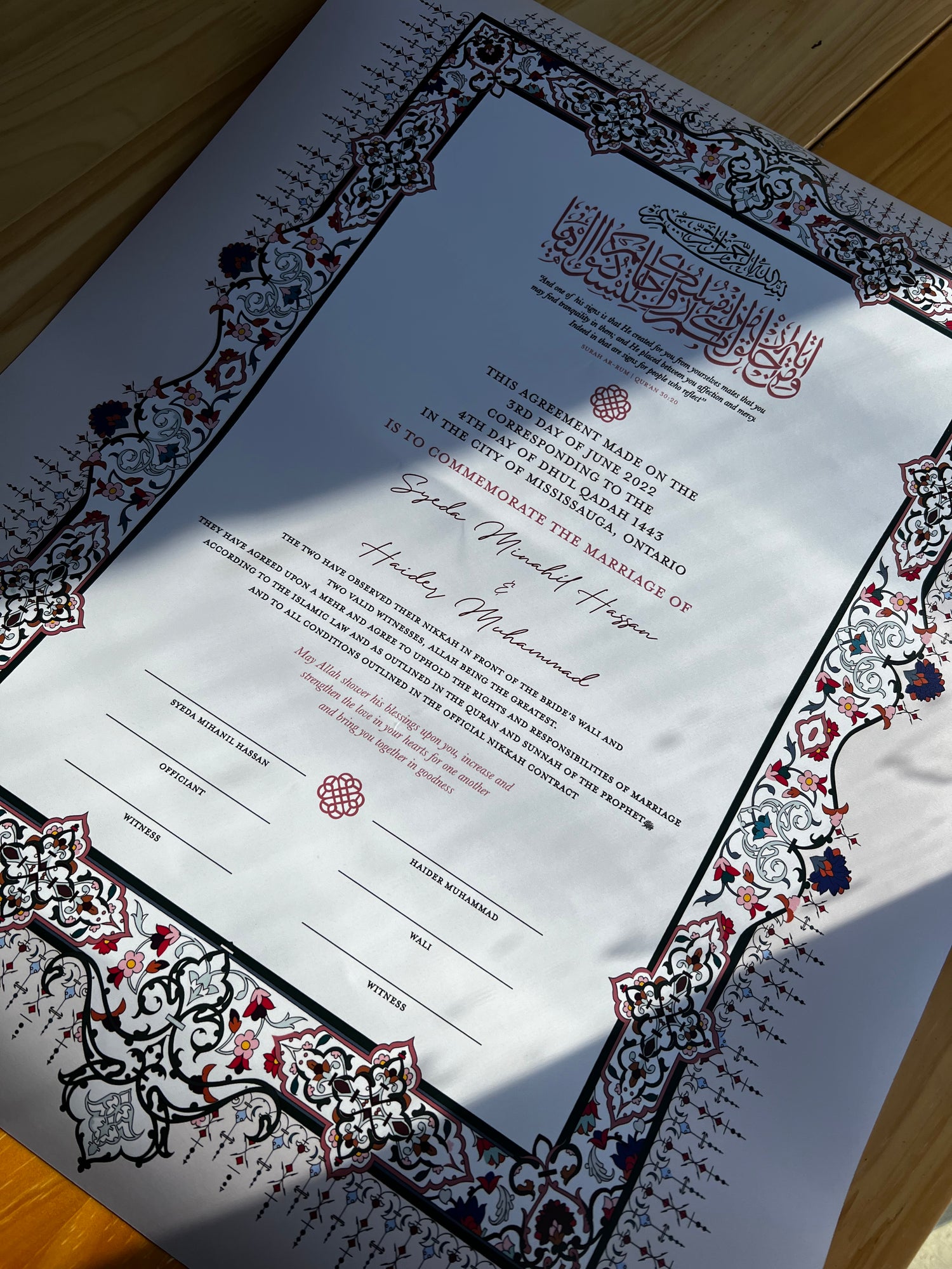 Capture the beauty of your Nikah ceremony and cherish your marriage with the timeless elegance of the Nawra - Pearl Nikah Certificate.