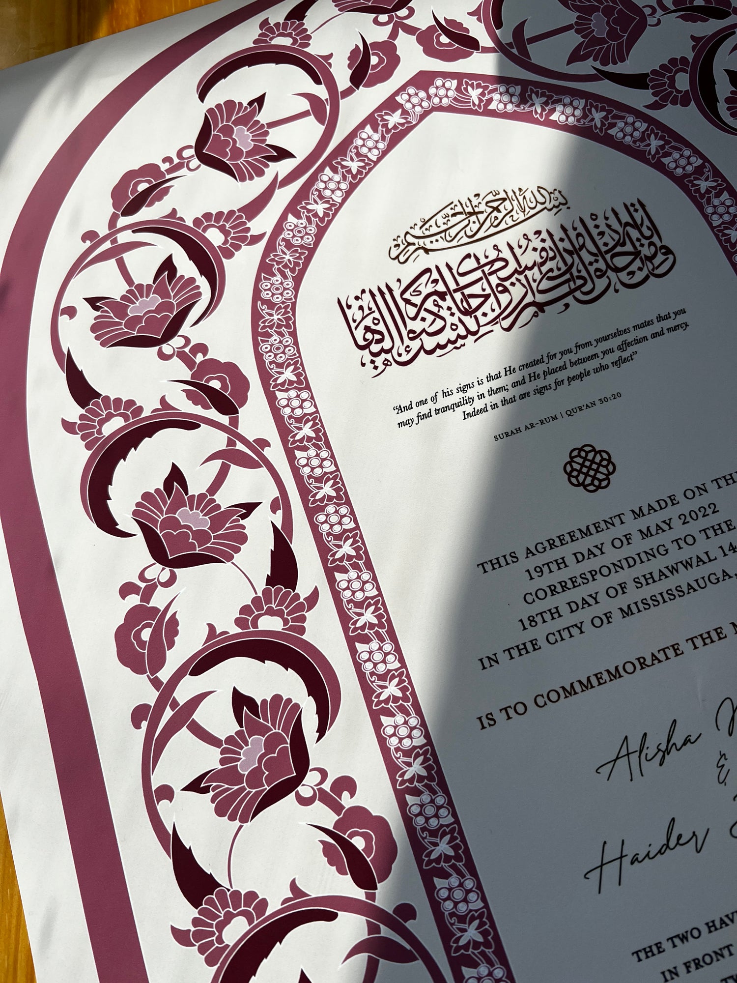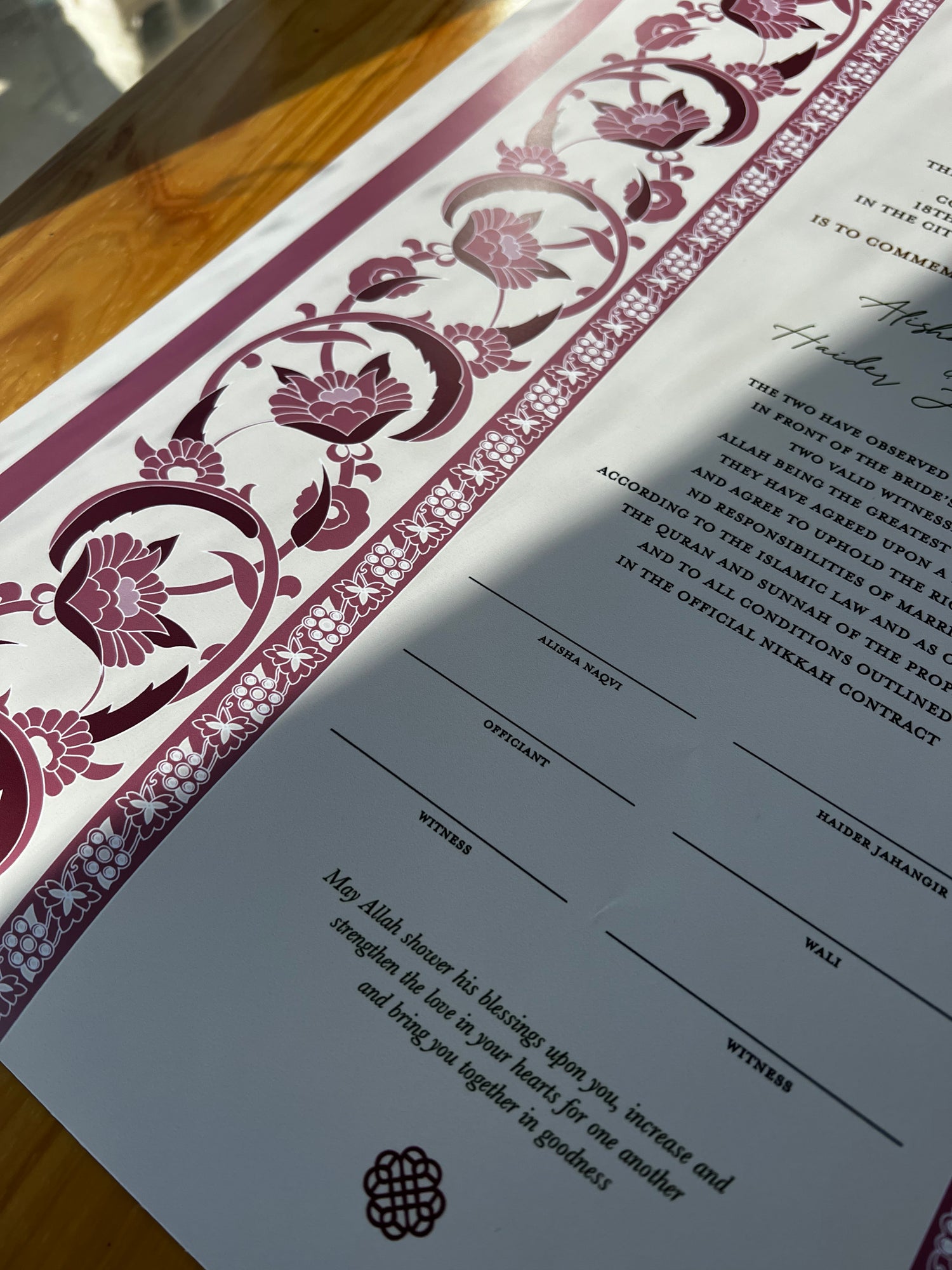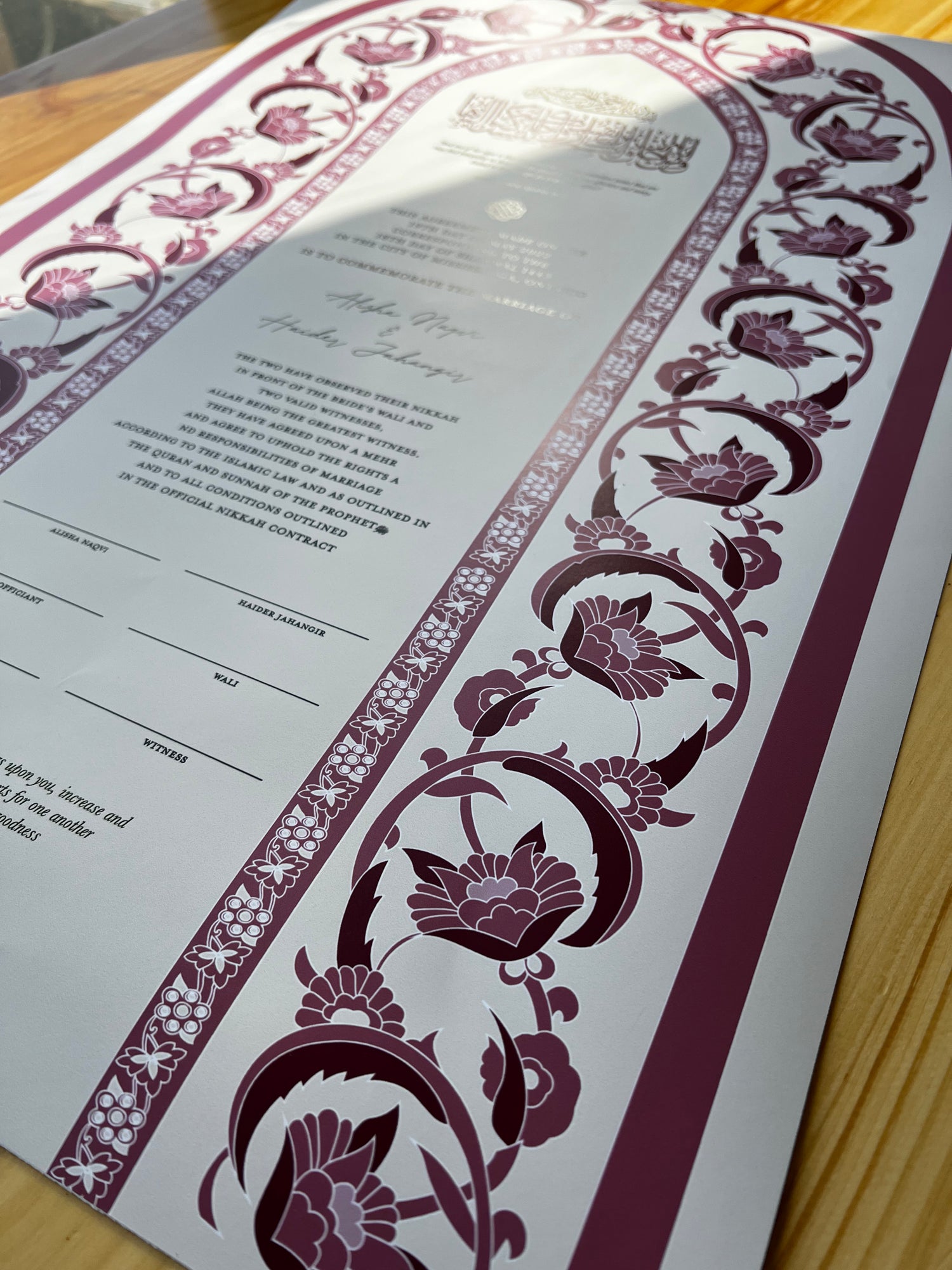With its sleek and minimalist design, this certificate captures the essence of contemporary elegance. Meticulously crafted with attention to detail, this Nikkahnama is a visually stunning testament to the beauty of your special day.