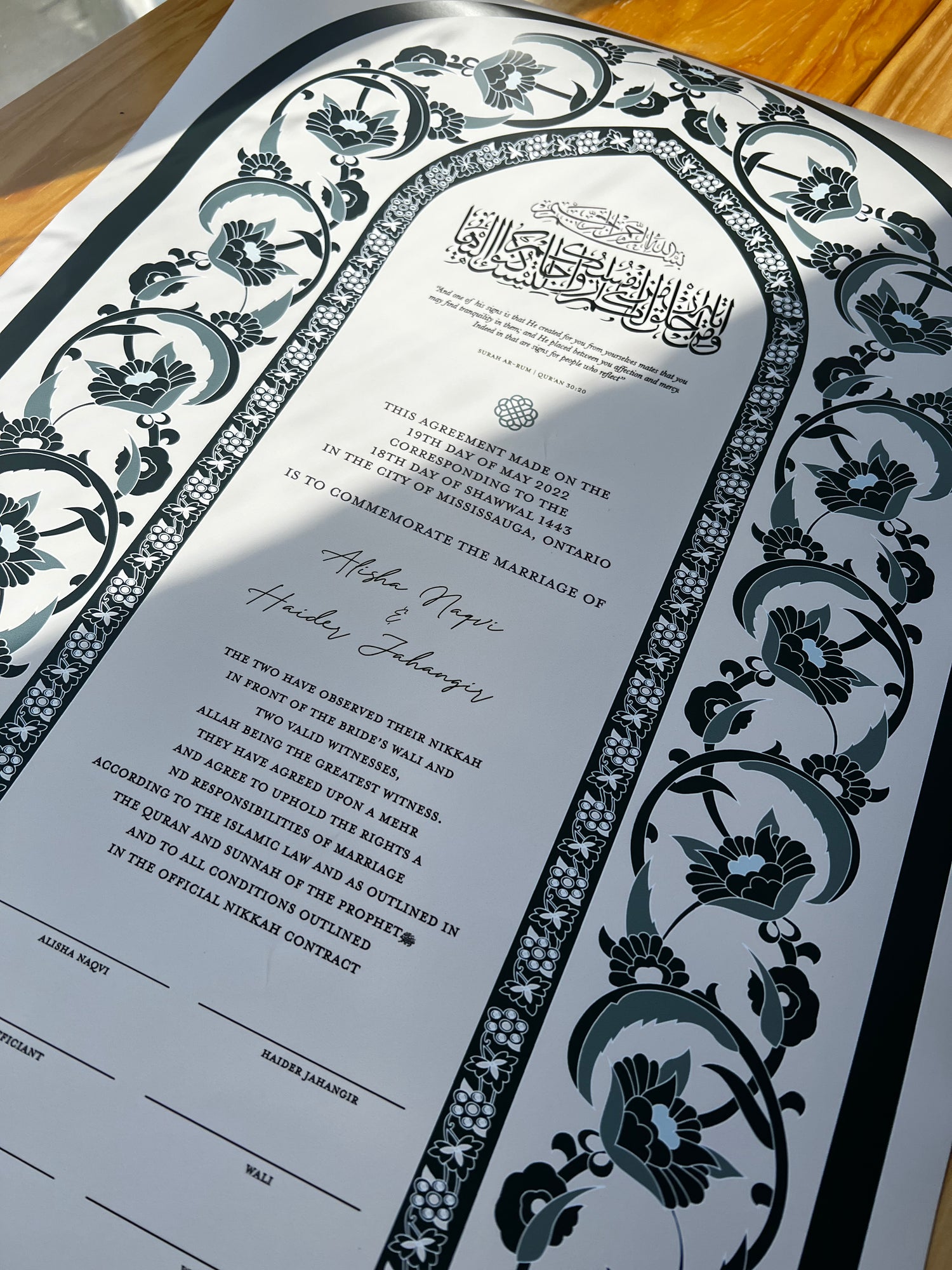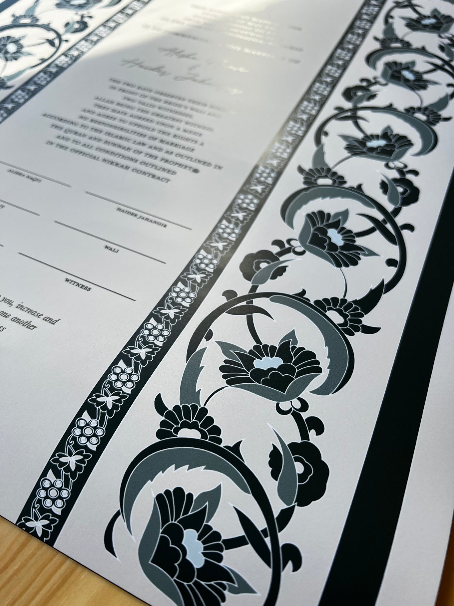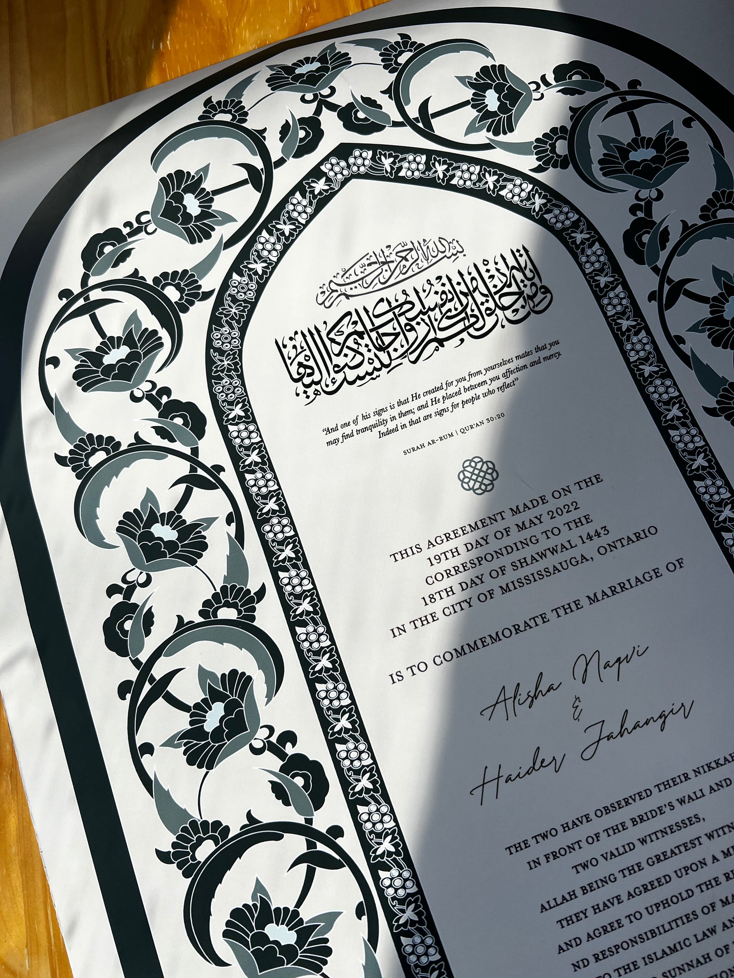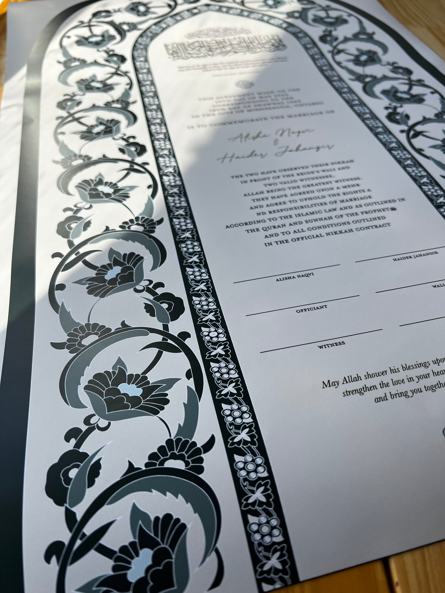With its sleek and minimalist design, this certificate captures the essence of contemporary elegance. Meticulously crafted with attention to detail, this Nikkahnama is a visually stunning testament to the beauty of your special day.